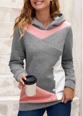 • Grey tops,Contrast Color tops,Decorative Button Grey Contrast Long Sleeve Hoodie